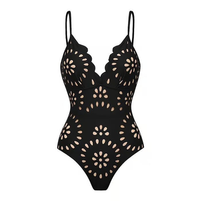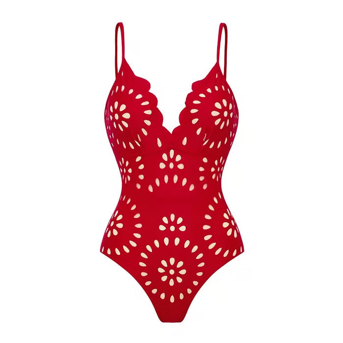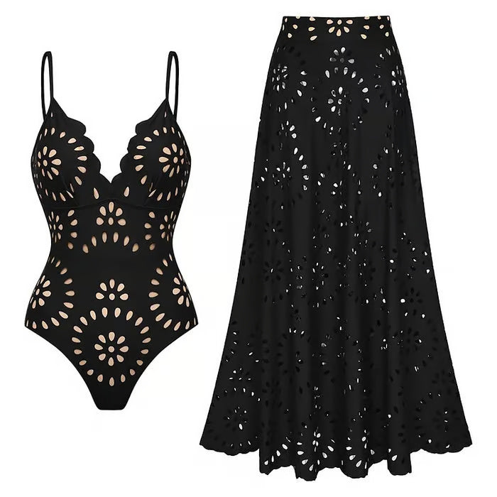 Elegant und feminin präsentiert sich der Badeanzug Karen, der sich durch sein zartes, durchbrochenes Blumenmuster und den schmeichelhaften Volantrock auszeichnet. Perfekt, um die Sonne mit Stil und Originalität zu genießen.